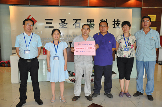 四、 董事長親自捐贈善款救助聽到侯孝友的實際困難匯報后,董事長非常關(guān)心,立即拿出私人款2000元現(xiàn)金資助,幫助侯孝友度過暫時的難關(guān)。鄭董還親自接待了侯孝友,詳細了解了他家庭目前的狀況,鼓勵他樹立信心,克服暫時困難,及時幫助妻子治療,引導兒女安心學習,同時,希望他在公司本職工作中繼續(xù)發(fā)揚不拍苦、腳踏實地的精神,積極專研技能,不要辜負三圣愛心傳遞的希望。