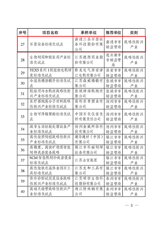 南通三圣標(biāo)準(zhǔn)化工作再傳捷報(bào),公司申報(bào)的“石墨設(shè)備標(biāo)準(zhǔn)化試點(diǎn)”項(xiàng)目獲得江蘇省市場監(jiān)督管理局、江蘇省發(fā)展和改革委員會正式立項(xiàng),成為2022年江蘇省戰(zhàn)略性新興產(chǎn)業(yè)標(biāo)準(zhǔn)化試點(diǎn)41個項(xiàng)目之一,也是南通市獲此立項(xiàng)的兩個項(xiàng)目之一 。