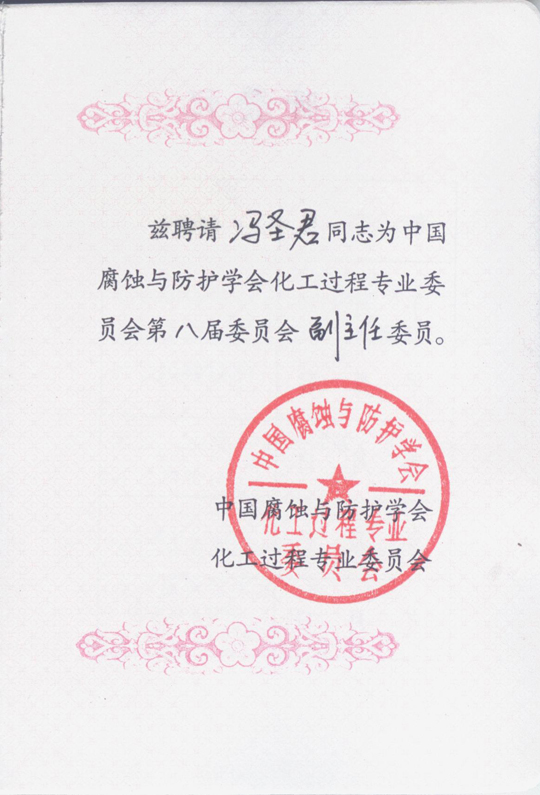 日前,公司馮圣君董事長(zhǎng)收到證書(shū),正式出任中國(guó)腐蝕與防護(hù)學(xué)會(huì)化工過(guò)程專業(yè)委員會(huì)第八屆委員會(huì)副主任委員。
